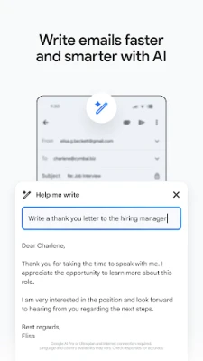 Fiind o componentă esențială a Google Workspace, Gmail este mai mult decât un serviciu de e-mail; este un centru de colaborare. Conectează-te cu echipa prin Google Chat, organizează-ți proiectele și persoanele în Spații dedicate și participă la apeluri video de înaltă calitate cu Google Meet, totul fără a părăsi mediul familiar al aplicației. Beneficiază de asistență inteligentă prin Scriere intuitivă și sugestii gramaticale, care îți optimizează fluxul de lucru și te ajută să te concentrezi pe sarcinile prioritare. Google Workspace îți oferă un ecosistem conectat, securizat prin aceleași modele avansate de învățare automată care blochează eficient amenințările cibernetice, asigurând o productivitate și o liniște sufletească de neegalat. Chiar și pe ceasul tău Wear OS, Gmail îți permite să vezi rapid e-mailurile printr-un card dedicat.