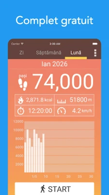 Cauți un partener de încredere pentru a-ți monitoriza activitatea fizică zilnică? Această aplicație pedometru este soluția ideală, transformând telefonul tău într-un antrenor personal, capabil să îți înregistreze automat fiecare pas, chiar și atunci când dispozitivul este sigur în buzunar sau geantă. Nu este nevoie de configurări complicate – doar o simplă atingere de „START" și vei începe să vizualizezi imediat pașii parcurși, caloriile arse, distanța, durata plimbării și viteza medie. Toate aceste informații vitale pentru sănătatea ta sunt afișate clar și intuitiv, menținând datele tale 100% private, stocate exclusiv pe dispozitivul tău, fără a fi vreodată transmise extern.